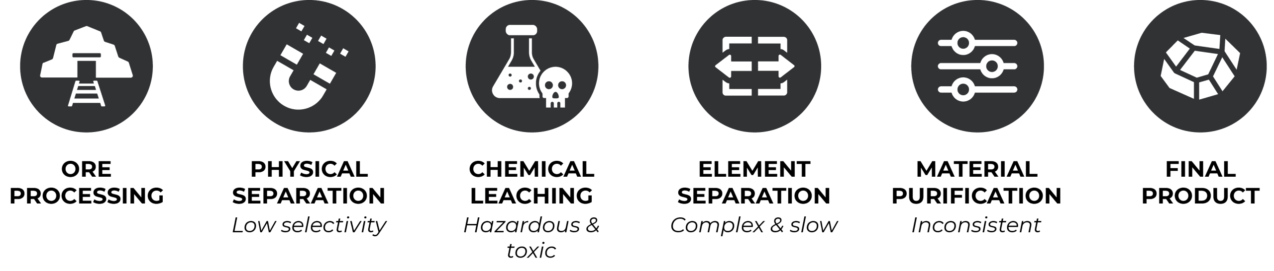 Current critical mineral recovery methods are complex, inefficient, and often environmentally burdensome. Traditional workflows involve multiple chemical and mechanical steps that can produce inconsistent results and rely on toxic reagents, raising sustainability concerns.