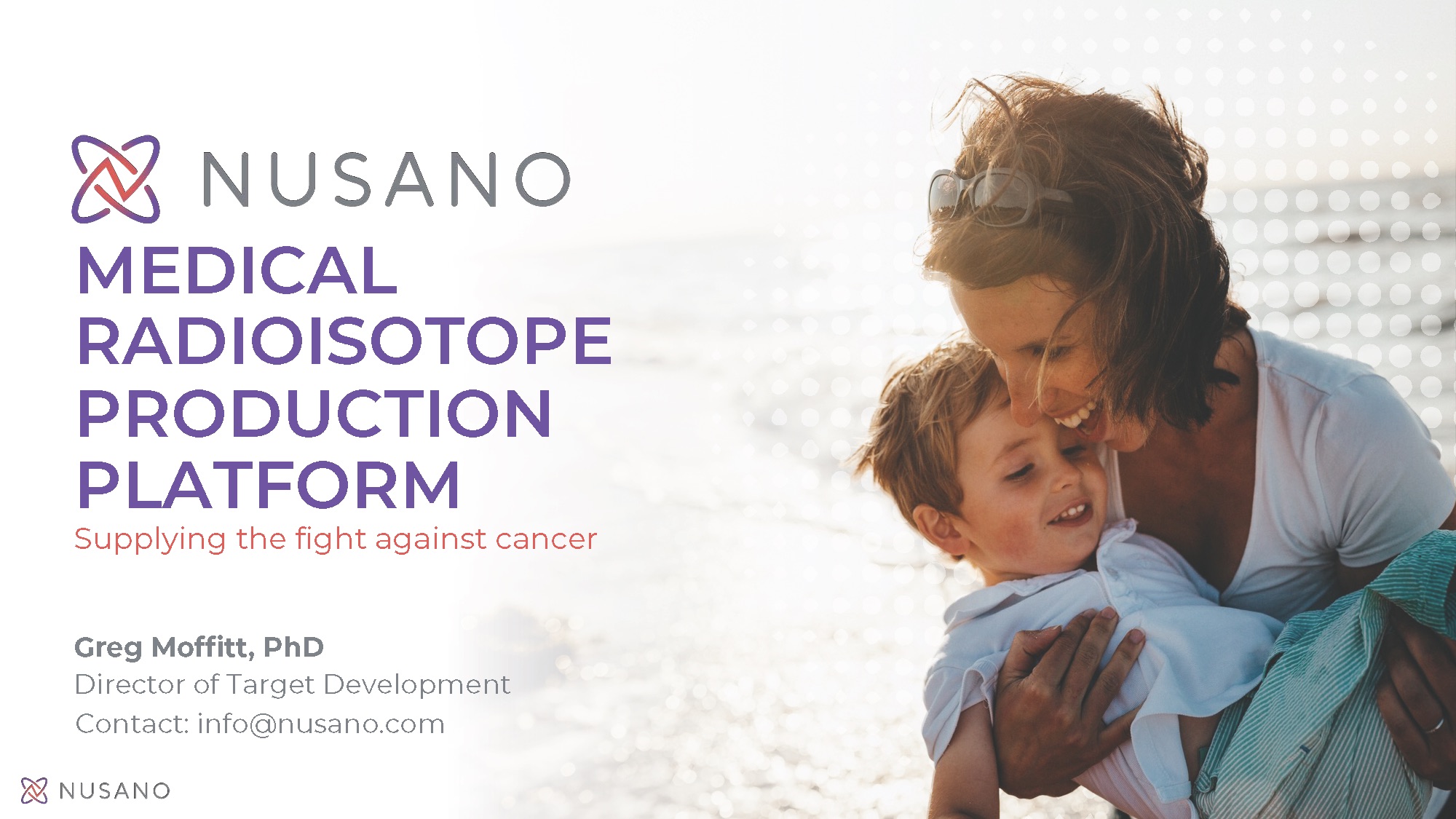 WEST VALLEY CITY, Utah – May 1, 2023 – Nusano, Inc., a medical technology company reshaping the production of cancer-fighting radioisotopes, today announced Gregory Moffitt, PhD, Director of Target Development at Nusano, will present an overview of the company’s breakthrough production platform to the European Cooperation in Science and Technology (COST) Astatine-211 Working Group on May 4, 2023. Presentation materials will be available on the company’s website following the event.