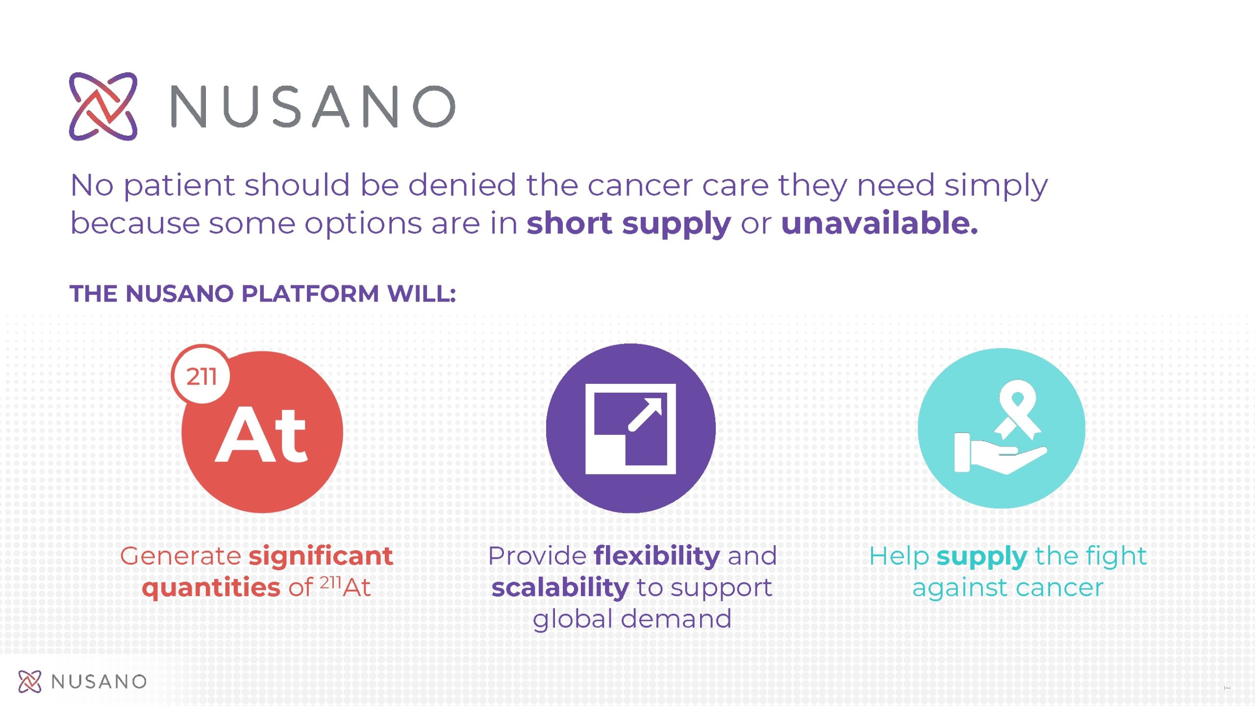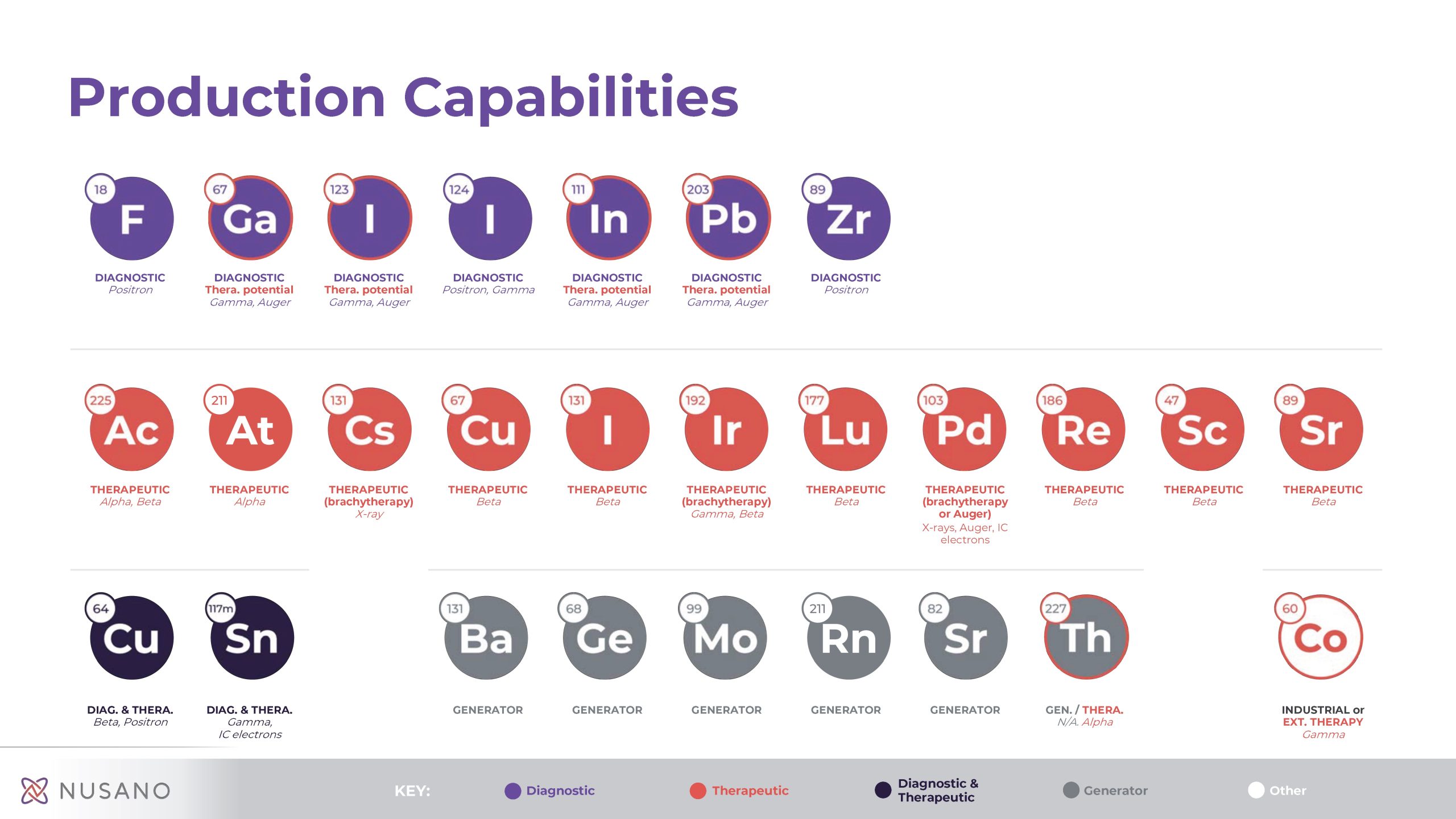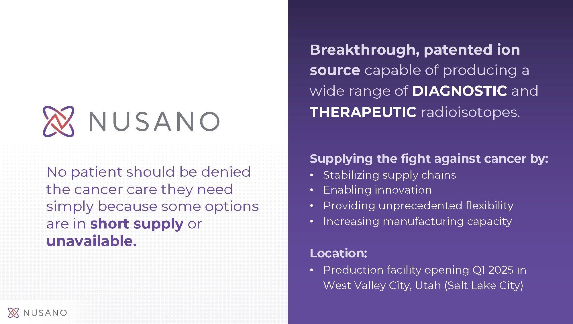 Nusano is a privately held medical technology company committed to bringing stability and innovation to the rapidly emerging and critically undersupplied medical radioisotopes market. Nusano’s proprietary ion source is smaller and more efficient than existing production methods. This results in significantly greater yields and allows for the simultaneous manufacturing of multiple radioisotopes. Nusano’s technologies will supply the fight against cancer and support diagnostic and therapeutic radiopharmaceutical development. The company’s state-of-the-art production facility opens Q1 2025 in West Valley City, Utah. For more, please visit www.nusano.com.