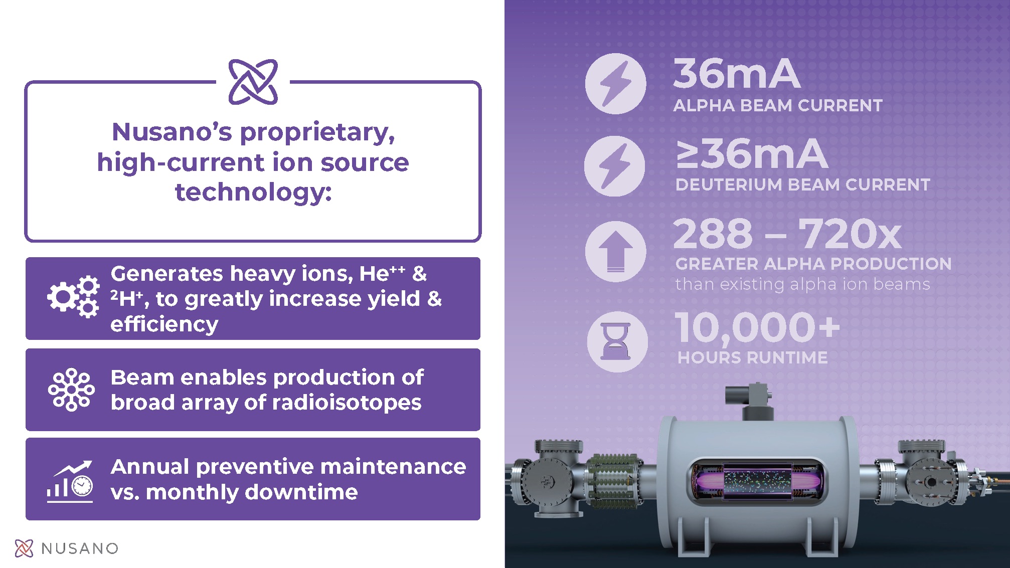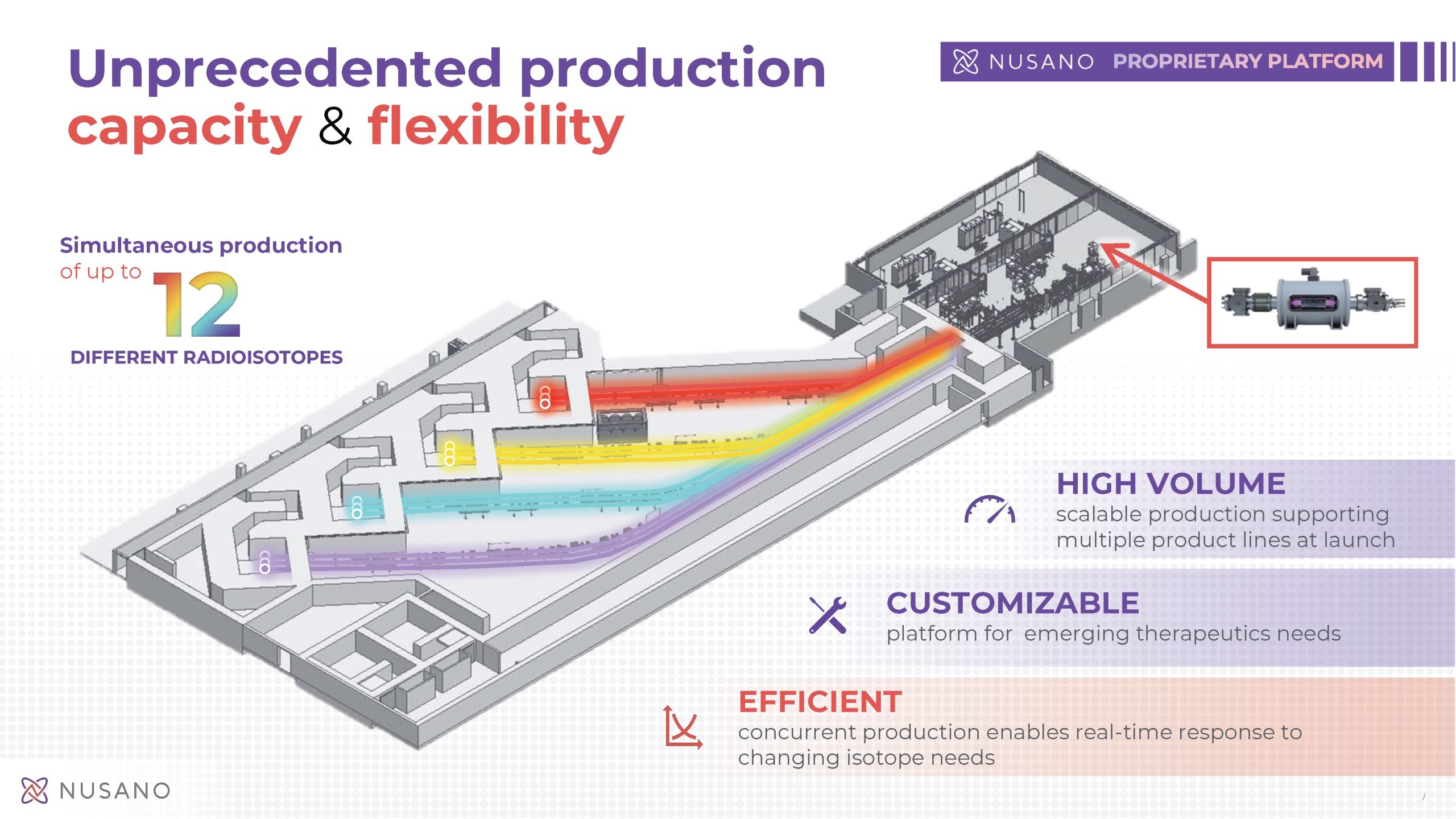 Opening the first quarter of 2025, Nusano’s West Valley City, Utah facility will produce a wide variety of rare and undersupplied medical isotopes in quantities sufficient to support both clinical development and commercial manufacturing of radiopharmaceuticals. Nusano’s proprietary ion source and pulsed beam can produce up to 12 different radioisotopes simultaneously. This novel and unique capability will give Nusano the flexibility to adjust radioisotope production levels in real-time to service existing needs and support emerging industry demand.