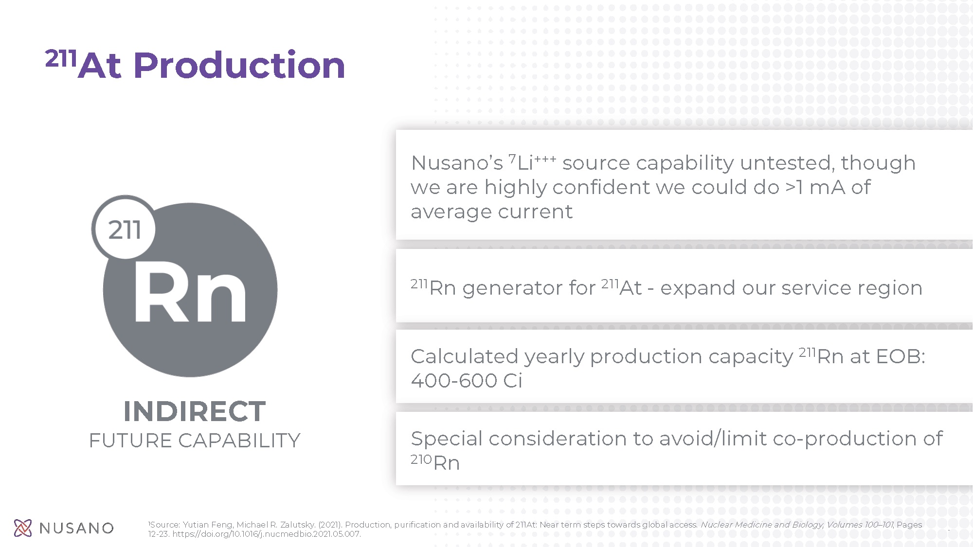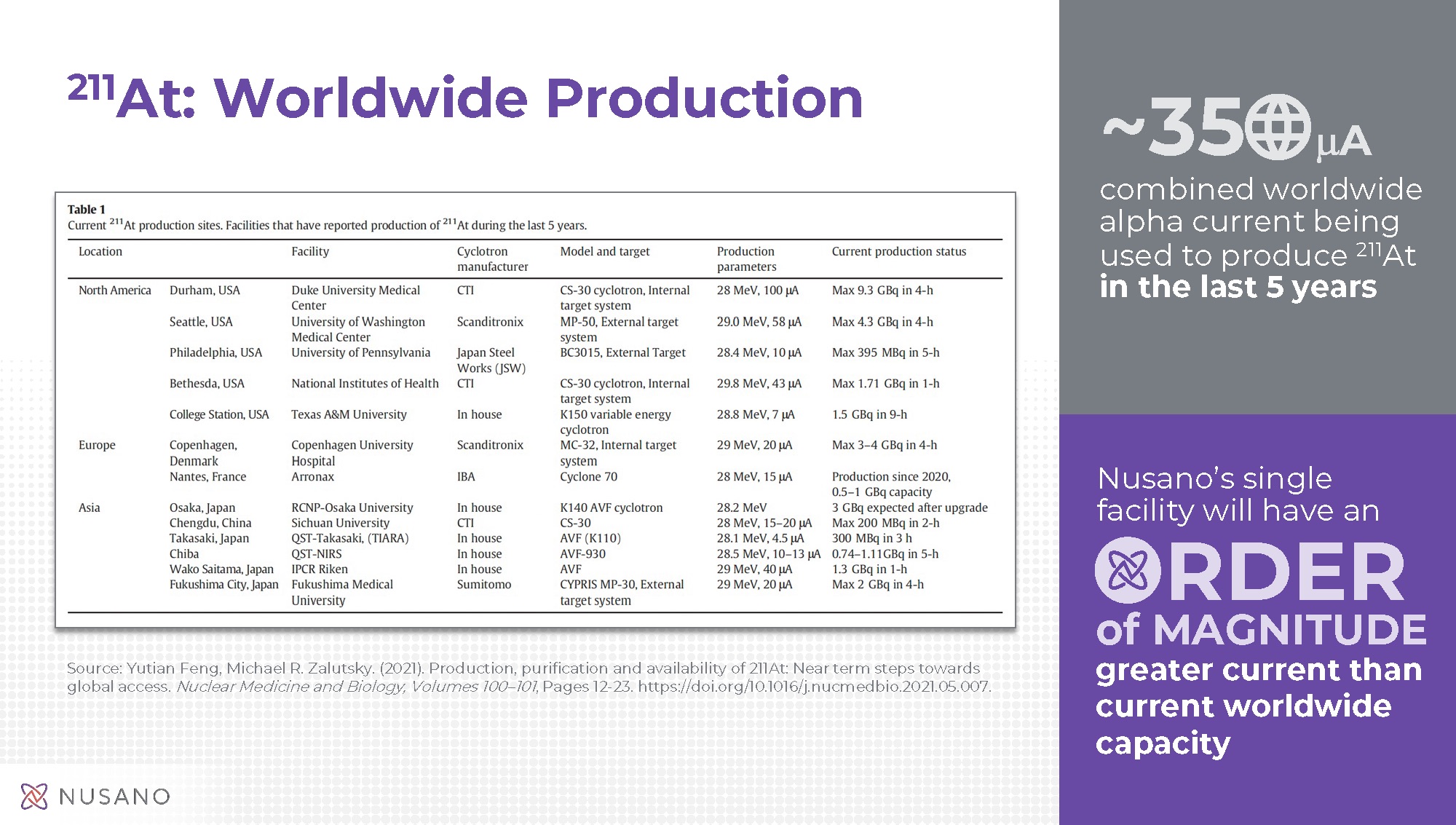 Production capacity of Astatine-211 (At-211) at Nusano’s first facility alone will be approximately 10 times the current global supply of the isotope. At-211 is an alpha-emitting radioisotope used in cancer-fighting medical applications called targeted alpha therapy (TAT). Increasing interest in the diagnostic and therapeutic applications of medical radioisotopes, including At-211, is exposing the fragility of existing supply chains and need for new production methods.